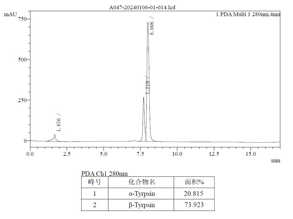 結論:檢測結果分析,β-Trypsin的含量可達70%以上,符合2020版中國藥典標準。