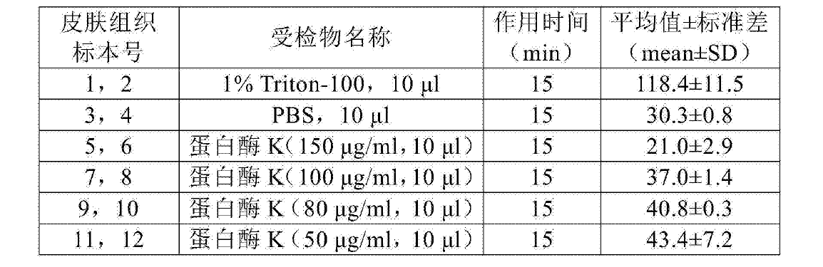 實(shí)驗(yàn)結(jié)果發(fā)現(xiàn)蛋白酶K在50μg/ml、80μg/ml、100μg/ml、150μg/ml、200μg/ml時(shí)對(duì)人皮膚細(xì)胞所分泌的IL-1α的量均沒(méi)有影響,表明蛋白酶K在上述檢測(cè)條件下不會(huì)誘導(dǎo)炎癥因子IL-1α分泌,顯示蛋白酶K對(duì)培養(yǎng)的人造皮膚3D模型中的活細(xì)胞沒(méi)有刺激作用,而僅去除了表皮死細(xì)胞[1]。