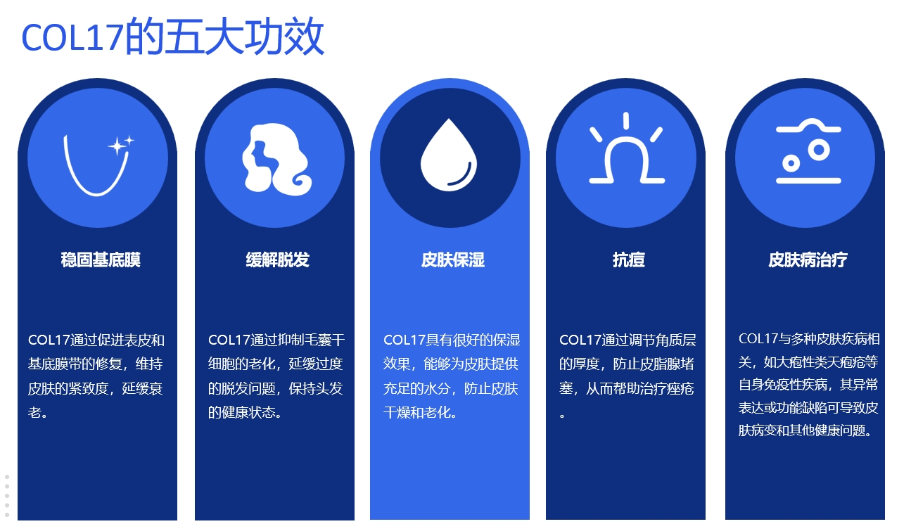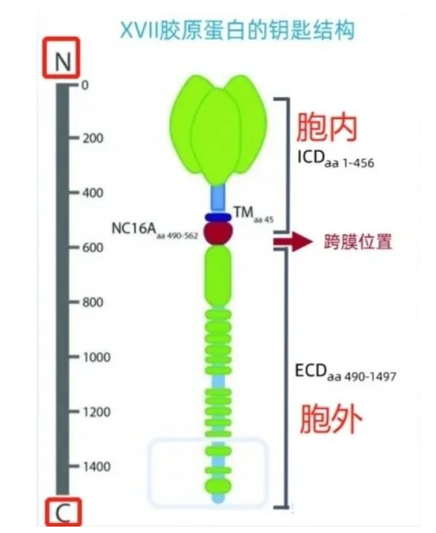 XVII型膠原蛋白,又稱COL17,作為一種跨膜糖蛋白,是表皮干細胞半橋粒的重要組成成分,主要位于毛囊球部的毛囊干細胞以及表皮和真皮連接處的表皮干細胞(ESC)中,其作用是使得表皮和真皮通過基底膜帶緊密連接,以促進表皮更替,穩(wěn)固基底膜。