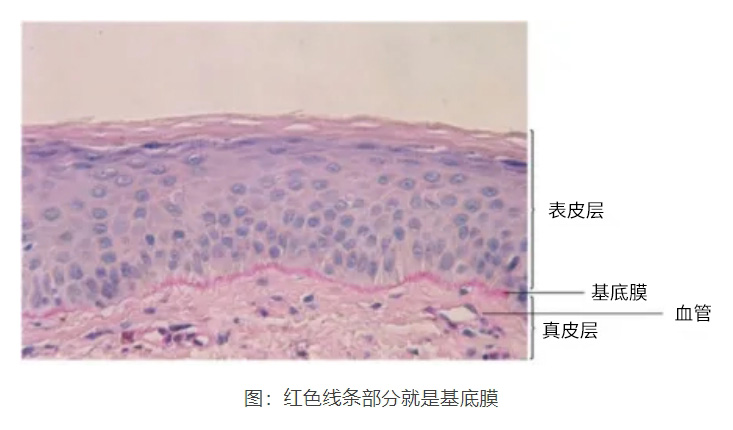 隨著皮膚的老化,基底膜會顯著變薄,衰老過程中XVII型膠原的減少,表皮干細胞丟失,導(dǎo)致半橋粒松散,從而基底膜帶受損。