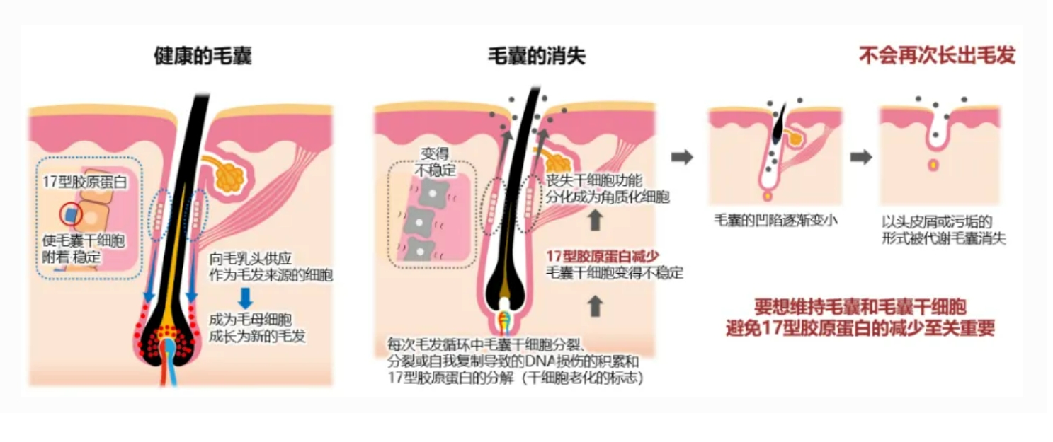 COL17不僅對毛囊有益,它在維持皮膚結(jié)構(gòu)和功能方面表現(xiàn)出色,有助于延緩皮膚老化。