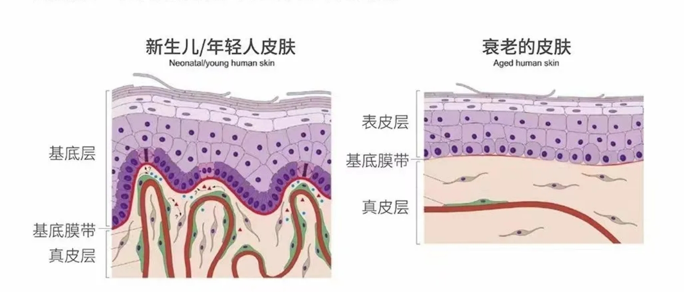 Ⅲ型膠原蛋白主要存在于皮膚、血管和內(nèi)臟器官中,抑制IL-6的分泌,修復(fù)真皮層的同時(shí),在維持皮膚柔韌性和彈性方面也起著重要作用; XVII型膠原蛋白是一種跨膜蛋白,主要存在于基底膜帶中,負(fù)責(zé)將表皮和真皮緊密連接在一起,在表皮層抗衰,增強(qiáng)表皮神經(jīng)末梢保護(hù),是維持皮膚整體結(jié)構(gòu)穩(wěn)定的重要因素。