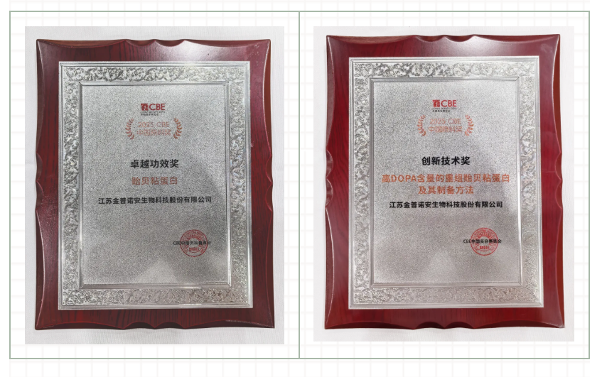 江蘇金普諾安生物科技股份有限公司憑借其明星產(chǎn)品重組貽貝粘蛋白(rMAP)脫穎而出,榮獲創(chuàng)新技術獎與卓越功效獎。